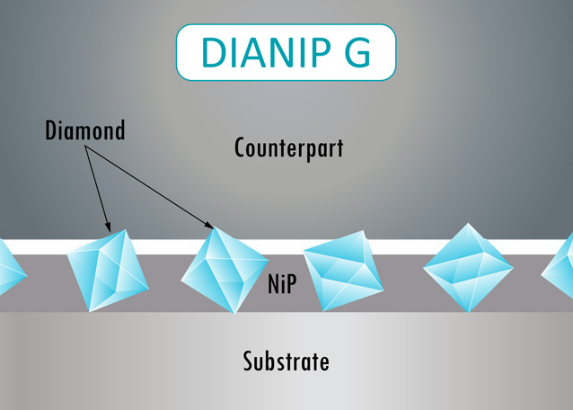 金剛石涂層是由單晶金剛石和化學(xué)鎳基體組成,DIANIP涂層嵌入的金剛石顆粒尺寸非常均勻一致。涂層功能性主要取決于嵌入涂層金剛石顆粒的尺寸。涂層功能主要體現(xiàn): 硬度、磨損性能、摩擦性能、配合性、尖銳化。單晶金剛石顆粒尺寸的完美選擇和定義使得涂層表面形貌非常規(guī)則,涂層定義明確化。共沉積和涂層是通過化學(xué)方法進行,這種方法可以完成完全規(guī)則厚度的表面涂層,而不受基體邊緣尺寸的影響,并且在復(fù)雜表面的狹小尺寸處也能完好的進行涂層并沉積金剛石顆粒。涂層可以保證金剛石顆粒60%的尺寸嵌入鎳涂層, 金剛石在涂層中牢固錨定。此外,DIANIP技術(shù)還允許在化學(xué)鎳的基體中引入高比重含有小粒徑(約3μm)的金剛石顆粒,生產(chǎn)出極為耐磨的復(fù)合涂層